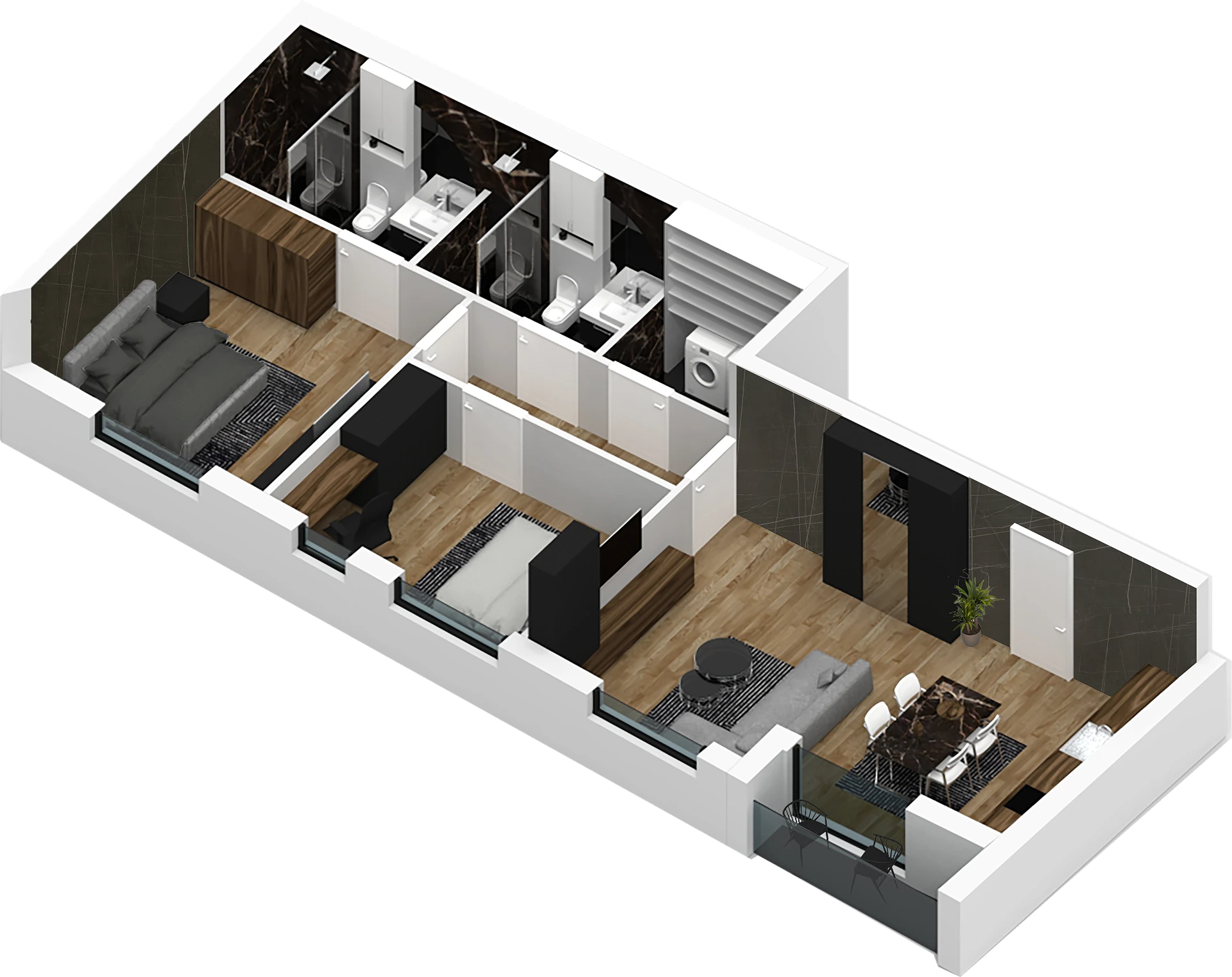 Trosoban stan od 73 m² poseduje prostran dnevni boravak povezan sa trpezarijom, uz funkcionalno odvojenu kuhinju; dve spavaće sobe uključuju master sobu sa sopstvenim kupatilom, dok drugo kupatilo dodatno podiže komfor. Posebna vešernica značajno olakšava održavanje doma i predstavlja retku pogodnost u ovoj kvadraturi.